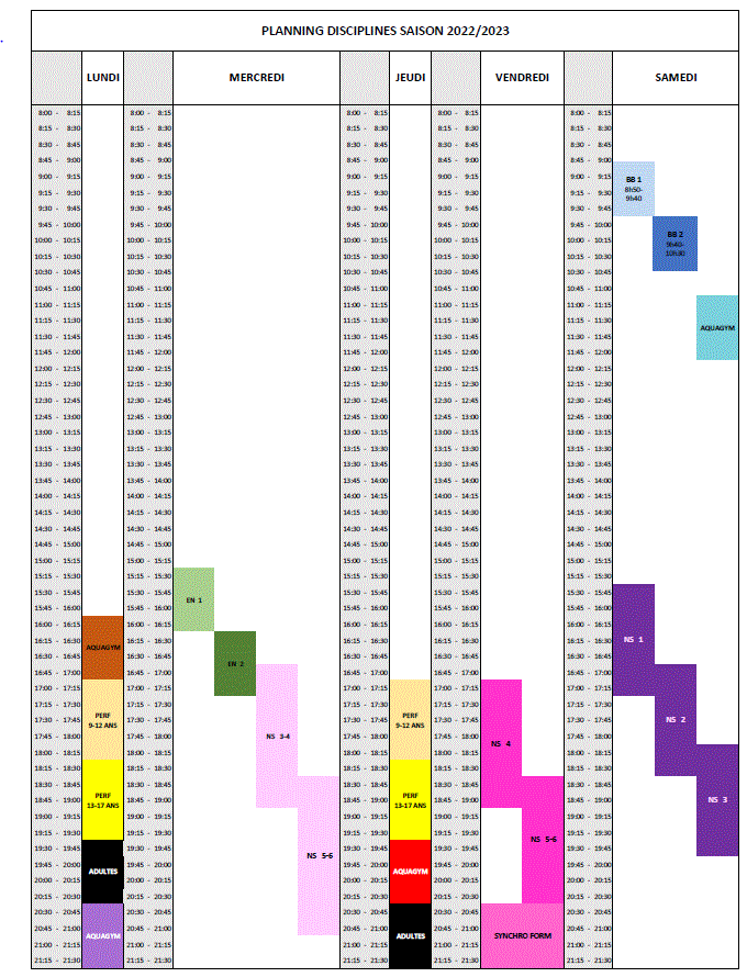 planning des entrainements saison 2021/2022NOUVEAU : créneau AQUAGYM MIXTE samedi 11h-12h