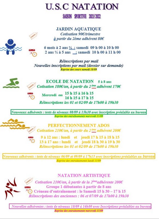 Règlements : Les cotisations ECOLE DE NATATION, PERFECTIONNEMENT, ADULTES, NATATION ARTISTIQUE et SYNCHRO FORM sont annuelles et réglées en 3 chèques datés du jour de l’inscription et joints au dossier. Les 3 chèques correspondent aux 3 trimestres de la saison sportive.